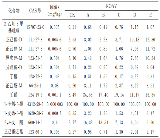 并不是樣品中化合物的含量越高,其對整體風(fēng)味貢獻(xiàn)就越高,而是需要結(jié)合其閾值一起分析,相對氣味活度值用來判定樣品中對整體風(fēng)味貢獻(xiàn)較大的物質(zhì),見表1。