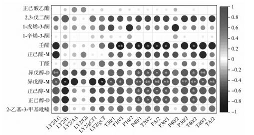 為研究電子鼻傳感器與香氣化合物之間的關(guān)系,采用Pearson相關(guān)系數(shù)對電子鼻傳感器與ROAV>1的香氣化合物進(jìn)行相關(guān)性分析,見圖8。由圖8可知,電子鼻的T和P傳感器與大多數(shù)化合物有相關(guān)性,比如T30/1、P1O/1、P¹0/2、P40/1、T70/2、PA/2、P30/1、P40/2、P30/2、T40/2、T40/1、TA/2,傳感器與樣品中的異戊醇-D、異戊醇-M、正己醇-M、正己醇-D、2-乙基-3-甲基吡嗪具有較高的正相關(guān)性,并且異戊醇-M與大多數(shù)T和P傳感器具有極顯著性(P<0.01);而壬醛與P10/1、P40/1、T70/2、PA/2、P30/1和T40/2傳感器具有顯著性負(fù)相關(guān)(P<0.05)。