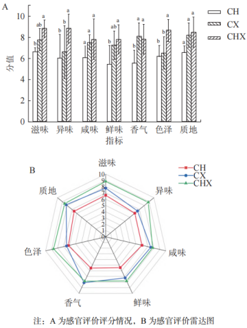 3種食用菌素肉排人工感官評價(jià)評分情況如圖3A所示。結(jié)合人工感官評價(jià)雷達(dá)圖(圖3B)分析樣品整體感官評分情況。海鮮菇素肉排整體感官評分優(yōu)于其他兩種,所有指標(biāo)平均分值均在 7~10 分;其次為香菇素肉排,在質(zhì)地、滋味、咸味、鮮味方面的評分略遜于海鮮菇素肉排,存在輕微苦澀味,且色澤不佳;而猴頭菇素肉排整體感官評分均低于其他樣品,各指標(biāo)平均分值均低于7分。