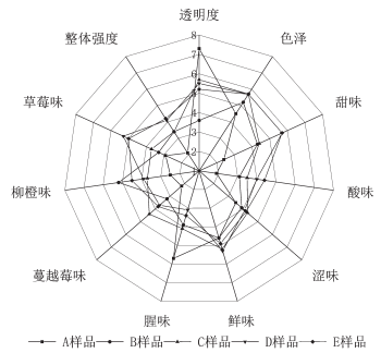 這5款膠原蛋白肽固體飲料在風(fēng)味特征上主要?dú)w納為以下4類(lèi)屬性,即口感、果味、外觀及整體強(qiáng)度,其中口感具體表現(xiàn)為酸、甜、澀、鮮和腥,氣味具體表現(xiàn)為草莓味、柳橙味、蔓越莓味等。由表2、圖1可知,這5款樣品在上述屬性上各有特點(diǎn)。①口感:E和D樣品的酸甜味最強(qiáng),腥味最弱;C樣品酸甜味適中,澀味最強(qiáng);A樣品腥味最強(qiáng),甜酸澀味最弱;B樣品的腥味適中,其他味較弱。②果味:B樣品表現(xiàn)出明顯的柳橙味,蔓越莓味和草莓味稍帶適中;C樣品則表現(xiàn)出明顯的蔓越莓味,柳橙味和草莓味稍帶適中;D和E樣品表現(xiàn)出明顯的草莓味,柳橙味和蔓越莓味稍帶適中;A樣品相比較于其他膠原蛋白固體飲料,帶有的果味最弱。③外觀:A樣品的透明度最強(qiáng),色澤最弱;B樣品的透明度最弱,色澤較弱;C、D和E的色澤相近,透明度適中。④整體強(qiáng)度:D和E樣品的整體口感和風(fēng)味度最強(qiáng),其次是B和C樣品,最弱是A樣品。說(shuō)明添加了果粉的膠原蛋白肽固體飲料在色澤、滋味和氣味方面更豐富。
