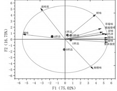 本研究對(duì)不同果味的膠原蛋白肽固體飲料的透明度、色澤、甜味、酸味、澀味、鮮味、腥味、蔓越莓味、柳橙味、草莓味和整體強(qiáng)度進(jìn)行了主成分分析,當(dāng)提取到2個(gè)主成分,累積的方差貢獻(xiàn)率達(dá)到91.77%,說(shuō)明這2個(gè)主成分可以涵蓋不同果味膠原蛋白固體飲料的大部分信息。如圖2所示,不同果味膠原蛋白固體飲料分散在各個(gè)區(qū)域,兩點(diǎn)之間距離越長(zhǎng),說(shuō)明兩個(gè)樣品的整體感官品質(zhì)差異越大;同時(shí)兩點(diǎn)距離越短,說(shuō)明兩個(gè)樣品間感官品質(zhì)含量差異越小,感官品質(zhì)較為相近。從PCA圖中,可以直觀地看到5款樣品的感官屬性各具特點(diǎn)。其中A樣品與其他樣品差異最大,故分布于F1的負(fù)半軸,風(fēng)味特征主要表現(xiàn)為腥味強(qiáng)、透明度高,其他感官屬性不明顯。B樣品的風(fēng)味特點(diǎn)主要為柳橙味比較強(qiáng),故分布在F2的負(fù)半軸;C、D和E樣品分布距離比較近,其特征表現(xiàn)為透明度、色澤和甜度等感官屬性比較接近。