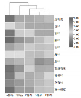4 不同膠原蛋白肽固體飲料的感官屬性熱圖聚類(lèi)分析