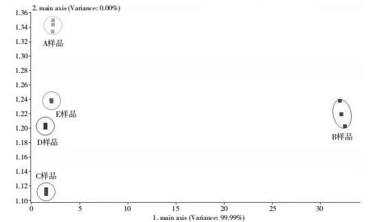 利用電子鼻對(duì)5種不同果味膠原蛋白肽固體飲料的揮發(fā)性成分進(jìn)行測(cè)定后,將采集得到的數(shù)據(jù)進(jìn)行主成分分析,分析結(jié)果如圖4所示。第1和第2主成分的累積貢獻(xiàn)率達(dá)到99.99%,說(shuō)明電子鼻對(duì)其揮發(fā)性成分表現(xiàn)出較高的識(shí)別度和靈敏度??傮w看,各樣品的揮發(fā)性成分有各自的分布位置,基本沒(méi)有重合,說(shuō)明電子鼻對(duì)于5種樣品氣味的區(qū)分度總體較好,所有樣品的風(fēng)味相對(duì)獨(dú)立,原因可能是因?yàn)椴煌赌z原蛋白肽固體飲料的配方組成存在一定差異,所以在不同果味膠原蛋白肽固體飲料形成的揮發(fā)性成分亦有所不同。C、D和E樣品在第1主成分上的相距較近,但在第2主成分上能完全區(qū)分開(kāi),說(shuō)明草莓味和蔓越莓味的膠原蛋白肽固體飲料的氣味上略有相似,而B(niǎo)樣品在第1主成分上與其他樣品相聚甚遠(yuǎn),說(shuō)明柳橙味的膠原蛋白肽固體飲料氣味與其他樣品差異最為明顯。根據(jù)感官結(jié)果發(fā)現(xiàn)A樣品在氣味上主要呈現(xiàn)腥味,B樣品為柳橙味的膠原蛋白肽固體飲料與A樣品在氣味上相差甚遠(yuǎn),從電子鼻分析結(jié)果得出,柳橙味的果粉相比較蔓越莓和草莓味的果粉的掩腥效果更好。