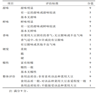 感官評定小組由江蘇省農(nóng)業(yè)科學(xué)院豆類研究室的8名老師及研究生組成。采用9分嗜好法對菜用大豆進(jìn)行感官評定,1、5、9分分別表示極度不能接受、一般、非常喜歡。結(jié)果表示為評分的平均值。感官評定標(biāo)準(zhǔn)詳見表1。