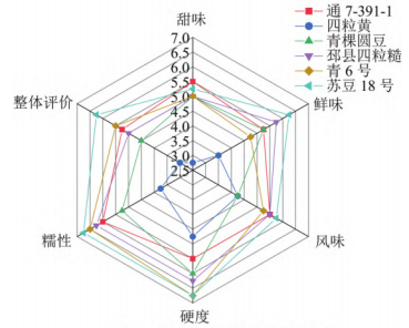 菜用大豆感官評價結(jié)果如圖1所示。通7-391-1甜味值最高,為5.50,甜味明顯。蘇豆18號在鮮味( 6.25)、香味( 5.75)、糯性( 6.75)、硬( 6.75)方面得分最高,而且綜合平均得分最高,為6.25,說明從整體來看,蘇豆18號具有菜用大豆固有的香氣,鮮味,口感軟糯滋味相對較好。四粒黃得分最低,為3.67,且與其他樣品的得分離散程度最大,說明口感滋味不符合大眾喜歡。