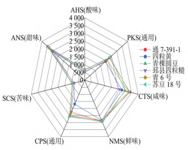 在感官評價方面,蘇豆18號更受消費者喜愛。在電子舌檢測結(jié)果中,蘇豆18號的鮮味的電子舌響應(yīng)值最高,通7-391-1的甜味響應(yīng)值最高。此外,通過人工感官評價和電子舌滋味響應(yīng)值數(shù)值進(jìn)行相關(guān)性分析,二者在鮮甜味方面呈現(xiàn)極顯著相關(guān)性,這說明電子舌與人工感官評價的結(jié)果在菜用大豆甜味和鮮味上具有高度一致性。