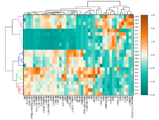 繪制聚類熱圖以呈現(xiàn)不同加工品揮發(fā)性成分整體特征的異同(圖3)。熱圖顯示,5類太子參加工品中,略燙后曬干品LT1~LT6單獨(dú)聚為一類,高溫烘干品GW1~GW4單獨(dú)聚為一類,低溫烘干品DW1~DW5單獨(dú)聚為一類,陰干品YG1~YG3、直接曬干品SG3聚為一類,直接曬干品SG1、SG3~SG5聚為一類,結(jié)果說明略燙后曬干品、高溫烘干品、低溫烘干品之間的揮發(fā)性成分差異較大,而直接曬干品與陰干品較為相似。
