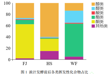 將FJ(發(fā)酵)、HS(后熟)、WF(未發(fā)酵)的濃汁樣品進(jìn)行GC-MS檢測,揮發(fā)性化合物種類以及各類物質(zhì)在樣品中的占比見圖1。由圖1可知WF樣品中共檢測出5類揮發(fā)性化合物,分別為:醇(13.56%)、醛(21.48%)、酸(1.56%)、酯(58.44%)、其他(4.96%),其中主要揮發(fā)性物質(zhì)為酯類;FJ樣品中共檢測出6類揮發(fā)性化合物,分別為醇(26.45%)、醛(2.17%)、酸(1.21%)、酯(7.75%)、酮(60.45%)、其他(1.98%),其中酮類為主要揮發(fā)性物質(zhì);HS樣品中共檢測出6類揮發(fā)性化合物,分別為醇(59.92%)、醛(1.42%)、酸(0.63%)、酯(1.44%)、酮(21.60%)、其他(14.99%),其中醇類為主要揮發(fā)性物質(zhì)。