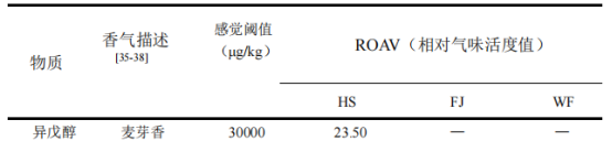 本實(shí)驗(yàn)通過對HS、FJ和WF樣品中的揮發(fā)性化合物進(jìn)行檢測,共檢測出揮發(fā)性化合物57種,其中醇類22種、醛類6種、酸類4種、酯類8種、酮類9種、其他類8種。對3組樣品中揮發(fā)性化合物相對含量與種類進(jìn)行PCA分析與聚類分析發(fā)現(xiàn),HS組揮發(fā)性化合物數(shù)量較多,其中主要物質(zhì)為芳樟醇、2-壬醇和2-十二烷醇等物質(zhì);FJ組主要揮發(fā)性化合物為2-壬酮、2-十一酮等物質(zhì);WF組揮發(fā)性化合物種類豐富,其中酸類物質(zhì)與醛類物質(zhì)占據(jù)主導(dǎo),為后續(xù)風(fēng)味物質(zhì)的形成奠定了基礎(chǔ)。通過ROAV值大小對濃汁發(fā)酵前后關(guān)鍵風(fēng)味物質(zhì)進(jìn)行判定,發(fā)現(xiàn)HS與FJ樣品中關(guān)鍵風(fēng)味物質(zhì)種類幾乎一樣,分別為14種和13種;反觀WF樣品中關(guān)鍵風(fēng)味物質(zhì)種類較少,僅有7種,這說明經(jīng)過發(fā)酵后的馬鈴薯濃汁在關(guān)鍵風(fēng)味物質(zhì)方面具有顯著性改善。