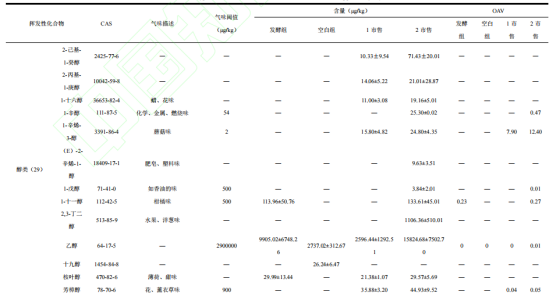空白組中十二醛(脂肪味)、十四烷醛(花、蠟味)、辛醛(脂肪、肥皂味)、壬醛(脂肪味)OAV>1,對空白組的風味起到主要作用。桉葉醇(薄荷、甜味)和1-十一烷醇(柑橘味,0.1<OAV<1)是發(fā)酵組中特有的風味物質,在發(fā)酵手撕牛肉干形成特殊風味中起到重要的作用。9-十六烯酸乙酯,為發(fā)酵手撕牛肉干提供了更多香味。