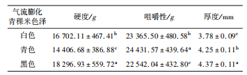 表3   3種色澤氣流膨化青稞米質(zhì)構(gòu)特性測定結(jié)果