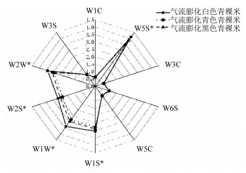 青稞的加工方式多樣,氣流膨化可以使谷物中的水分汽化,谷物組織因劇烈爆破伸展,最終造成組織結(jié)構(gòu)和理化性質(zhì)的改變,在保持食品品質(zhì)方面優(yōu)于傳統(tǒng)膨化方法。本研究采用氣流膨化工藝,以白、青、黑3種色澤青稞膨化米為研究對象,采用電子鼻、電子舌、電子眼、質(zhì)構(gòu)儀等設(shè)備對其風(fēng)味特征進(jìn)行比較。