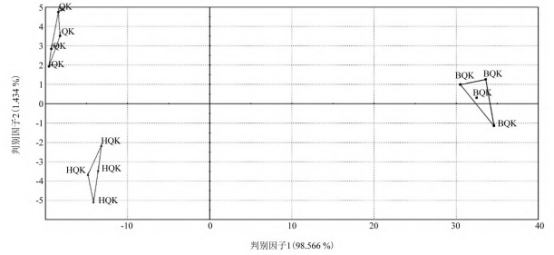 由圖3可知:PC1和PC2對總方差的貢獻(xiàn)率分別為99.925%和0.07441%,總和接近100%,說明電子舌能夠區(qū)分三種氣流膨化青稞米的滋味變化信息,且3者之間的滋味存在差異。由圖4可知:第1區(qū)分指數(shù)為98.566%,第2區(qū)分指數(shù)為1.434%,二者合計為100%,可見判別因子分析3種色澤氣流膨化青稞米滋味差異的效果更好,膨化白色青稞米與膨化青色青稞米、膨化黑色青稞米滋味存在較大差異,膨化青色青稞米與膨化黑色青稞米滋味存在較小差異。