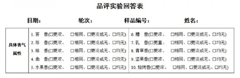中心點剖面法(Pivot Profile)是一種基于自由描述的快速感官分析方法。該方法無需評價人員記住固定的專業(yè)描述詞,以評價人員累積的感官經驗為基礎,采用成對比較的方式自由描述所感知到的樣品間具有差異的感官特征,可以更全面、更便捷、更有效的建立所測試產品類型的感官指標體系。適合項全選法(Check-All-That-Apply,CATA)也是一種快速感官描述分析技術。該方法要求評價人員基于對樣品的感知,選出所有適用該樣品屬性的描述詞,以所有評價人員對每個樣品描述詞上的累積頻次之和作為該樣品描述詞的呈現強度,但是 CATA 主要提供樣品有無某種感官屬性的信息,在感官屬性強度的測量與比較方面具有一定的局限性。Pivot - CATA 是 CATA 的升級版,彌補了 CATA 不具備量化的缺點,它能讓評價人員在特定感官指標下評價各樣品感官強度相對于參比樣(P 樣品)的高低情況,因不需要度量具體感官強度值,大大提高了各評價人員間量化結果的統(tǒng)一性,保證了合并所有評價人員數據的有效性。這兩種方法分別在咖啡、茶葉等有所應用,但組合使用鮮有報道。Pivot Profile 通常為 Pivot - CATA 提供產品評價所需要的感官指標,而這種指標提供方式幫助 Pivot - CATA 在樣品間品質差異量化分析時,具有比 Pivot Profile 更高的精度,這種組合具備了 QDA 中感官指標確定和量化評價的功能,卻比 QDA 操作更方便、更快速。此外,Pivot Profile 和 Pivot - CATA 通常需要大量消費者(一般都 60 位以上)進行實驗來保證結果的可靠性,但白酒具有風味復雜、刺激強烈的感官特性,采用經驗豐富的專業(yè)評價員,更能充分體現 2 種方法的便捷性優(yōu)勢,使得這種組合不僅能減少評價員人數、縮短感官評價時間,還能獲得穩(wěn)定、可靠的感官結果。