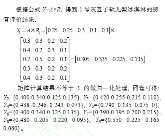 矩陣中的行向量代表灰豆子軟兒梨冰淇淋的色澤、形態(tài)和組織狀態(tài)、口感、滋味和氣味、雜質(zhì) 5 個維度, 列向量分別代表冰淇淋的優(yōu)、良、中、差 4 個評分維度。得到u1 ={0.3 0.3 0.2 0.2}, 同理得到 u2 ={0.4 0.2 0.3 0.1}, u3 ={0.20.5 0.2 0.1}, u4 ={0.3 0.3 0.2 0.2}, u5 ={0.4 0.3 0.2 0.1}把上述得到的 5 個因素評價結(jié)果組成一個矩陣。根據(jù)公式 Y=A×R, 得到 1 號灰豆子軟兒梨冰淇淋的感官評價結(jié)果: