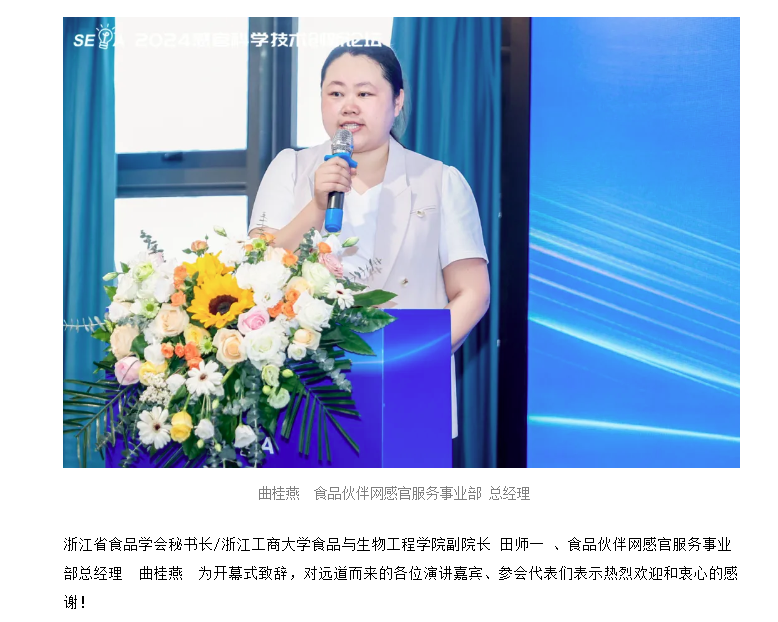 2024年5月15日,由食品伙伴網(wǎng)和浙江省食品學(xué)會聯(lián)合主辦,全球化學(xué)感官研究聯(lián)盟(GCCR)、湖北省照明學(xué)會、西安交通大學(xué)第二附屬醫(yī)院、上海盛評檢測技術(shù)有限公司協(xié)辦,濟南智感分析儀器有限公司、煙臺食邦信息科技有限公司、感知網(wǎng)共同支持的“2024 感官科學(xué)技術(shù)創(chuàng)新論壇”在杭州萬信瑞鉑酒店盛大開幕!