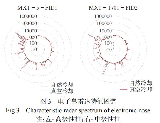 為了解析自然冷卻的醬牛肉和真空冷卻的醬牛肉之間揮發(fā)性化合物差異 ,采用儀器配套的 GalleryPlot 插件生成指紋圖譜,見圖 1。