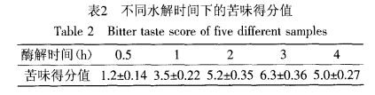 本文首先對大豆肽的苦味特性進(jìn)行人工感官評價(jià),然后冉研究電子舌儀器進(jìn)行感官分析。本實(shí)驗(yàn)從對苦味敏感的專業(yè)人員中選取10位感官評價(jià)員(5男5女)進(jìn)行感官評價(jià),每次品嘗之后,需要用清水漱口,再進(jìn)行下一次品嘗。最后,將與其口味接近的奎寧標(biāo)準(zhǔn)液濃度對應(yīng)的分值記為此溶液的得分。之后取10位評價(jià)人員的平均分為苦味評定分?jǐn)?shù)。以奎寧的作為評分標(biāo)準(zhǔn),評分標(biāo)準(zhǔn)見表1。表2為風(fēng)味蛋白酶不同水解時問下的苦味得分值。