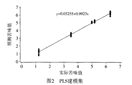 用PLS建立大豆肽溶液電子舌苦味預(yù)測模型,并對電子舌傳感器響應(yīng)值與人工感官評價(jià)得分值問的相關(guān)性進(jìn)行研究。以七根傳感器的響應(yīng)信號值為白變量,以感官得分值為因變量構(gòu)建偏最小二乘模型。建模集為60個樣本,驗(yàn)證集為30個樣本。結(jié)果如圖2、圖3所示,分別表示建模集、預(yù)測集的實(shí)際苦味值與預(yù)測值的相關(guān)圖。