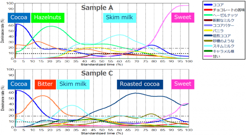 TDS品評(píng)法 旨在收集受試者在品嘗產(chǎn)品期間感知到的主要感覺的序列。例如,在品嘗一塊巧克力時(shí),從攝入到吞咽,品評(píng)人員可以依次感知可可、可可脂、榛子可可和甜味等屬性作為主導(dǎo)感覺。