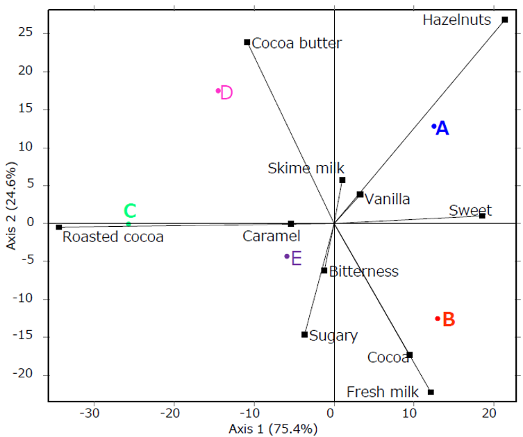通過TDS方法來分析5個(gè)牛奶巧克力之間的感官特征