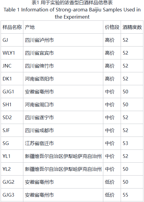 1、材料與試劑為了保證實驗結果的代表性、科學性和參考性,本研究從品牌代表性(11 個品牌)、產品多樣性(20 款樣品)及產區(qū)廣泛性(涉及安徽、河南、江蘇、四川、新疆 5 個省份),選擇了 20 款 2024 年產的酒精度在 50-52%vol 的市售主流濃香型白酒成品,具體樣品信息見表 1。為保證樣品的真實性,均通過正規(guī)渠道進行采購。