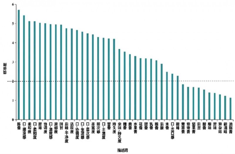 為確保對應分析結果的準確性與可解釋性,篩選出具有高區(qū)分度與高共識性的關鍵感官屬性。參考 Longo 等的數據處理方式,計算各描述詞在 20 款樣品中差值得分的標準差,其值越小說明該指標對于區(qū)分各樣品間差異的貢獻度很小,即各樣品在該指標下差異很小。Longo 等在研究中保留標準差 > 1.5 的描述詞,考慮到濃香型白酒成品自身風味的復雜性及對核心差異指標的要求,本研究刪除標準差<2 的描述詞(見圖 6),包括酸香、青草香、焙烤香、堅果香、油脂香、糠味、異雜味、新酒味、苦味和后苦等 10 個描述詞,保留 31 個描述詞用于后續(xù)對應分析。